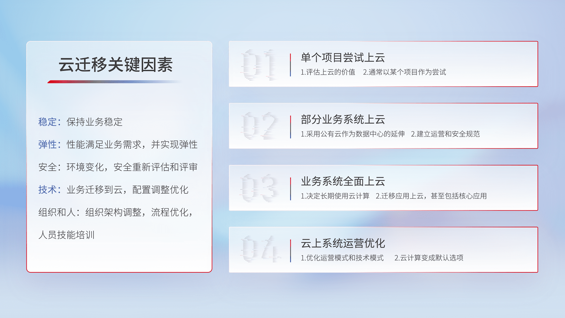 结合实际业务,,,从规划设计、、云平台选型、、、云原生改造、、、数据迁移、、、、集成交付,,,,迁移全过程为客户识别最佳上云路径,,,,做好风险识别管理,,,设计网络架构、、、、身份权限、、、安全审计合规、、、、操作审计、、、日志审计、、监控告警策略、、、、多站点容灾设计等,,对云上基础设施进行整体规划,,,,提升IT治理水平,,,,以满足弹性、、高可用、、、、高性能的需求。。。