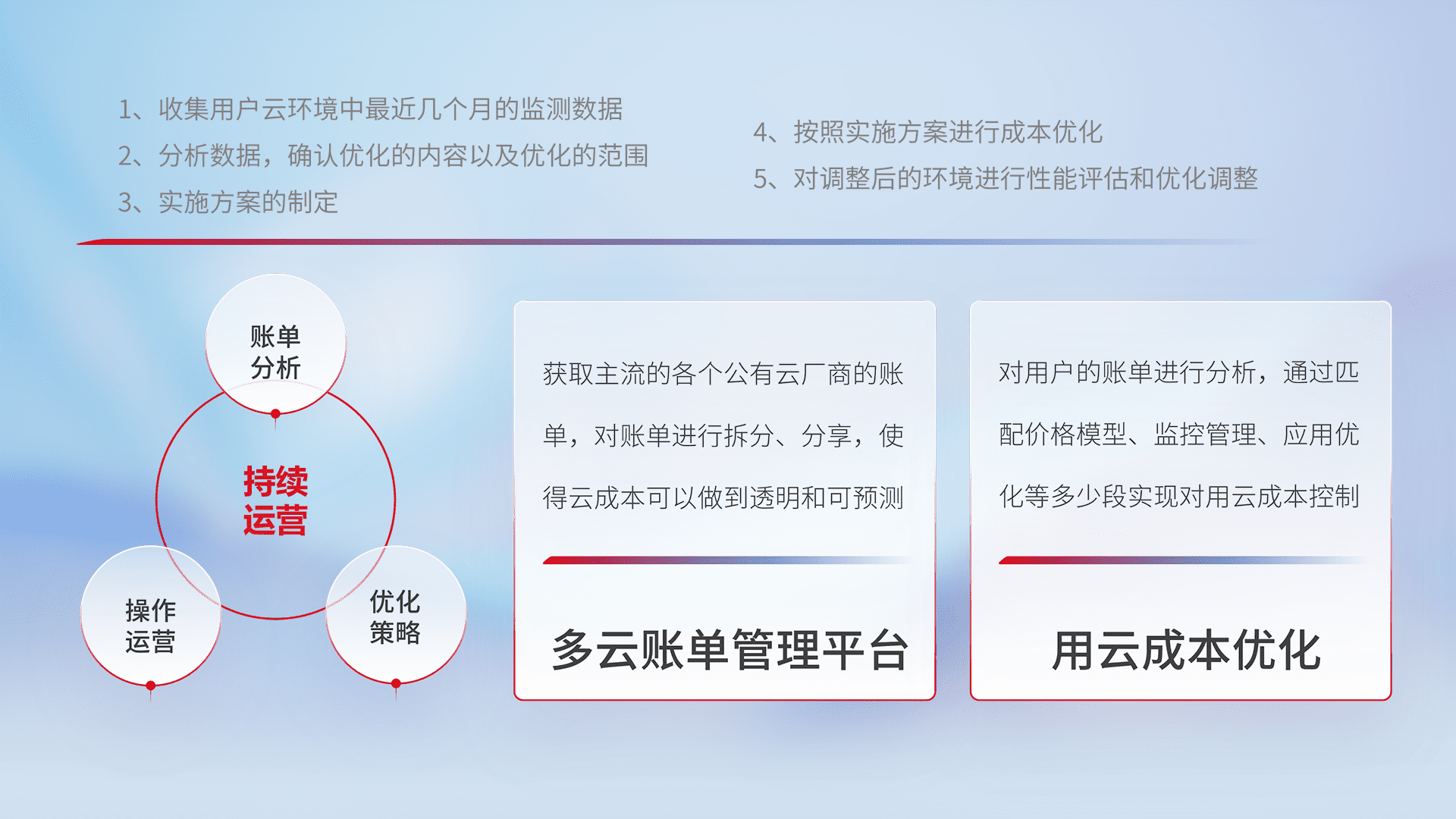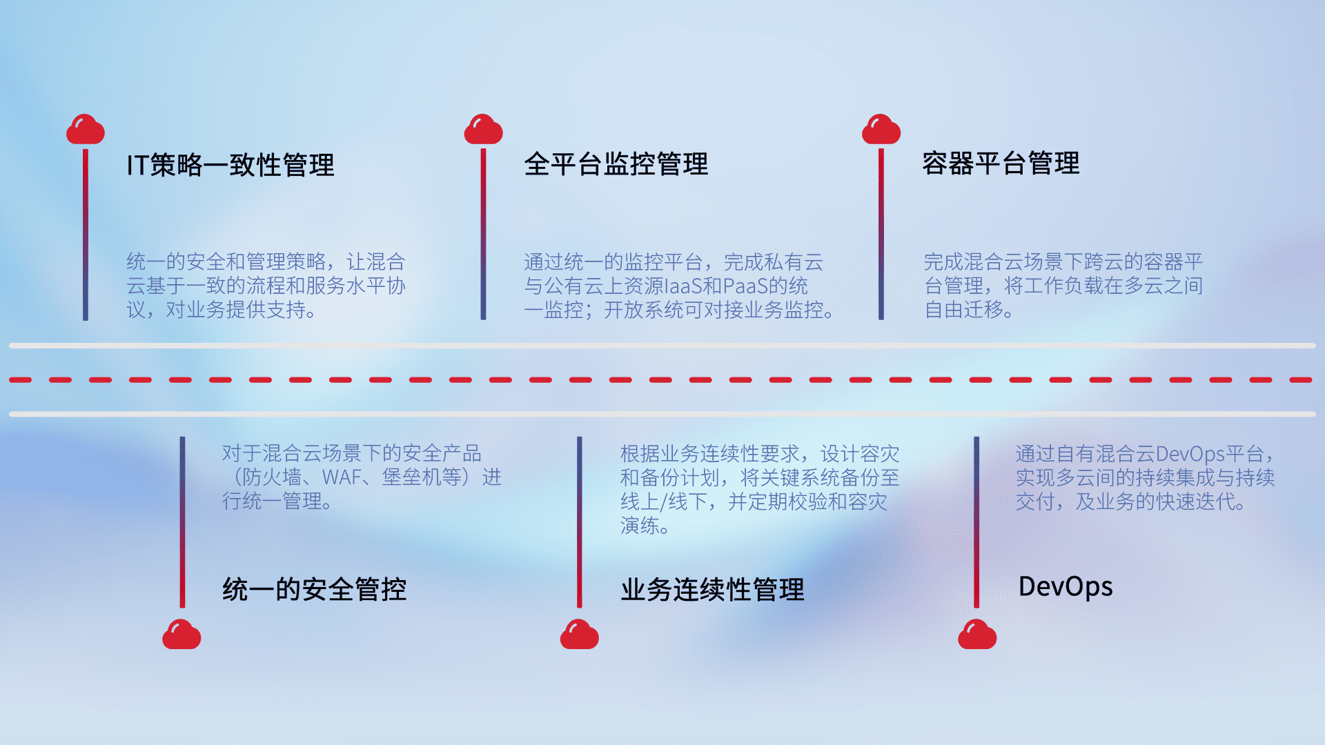 通过多云纳管,,以统一的资源数据模型把客户的云资源进行抽象和封装,,,,进而实现对多云资源的统一操作,,,保障云资源管理的可靠性、、、稳定性与可用性。。。。量身定制化运维内容,,,配置、、、开发运维、、补丁管理、、备份、、、、监控、、认证和访问管理、、、审计和日常巡检等,,,,保障在用云过程中的可靠度,,,,稳定度以及高可用率。。。。