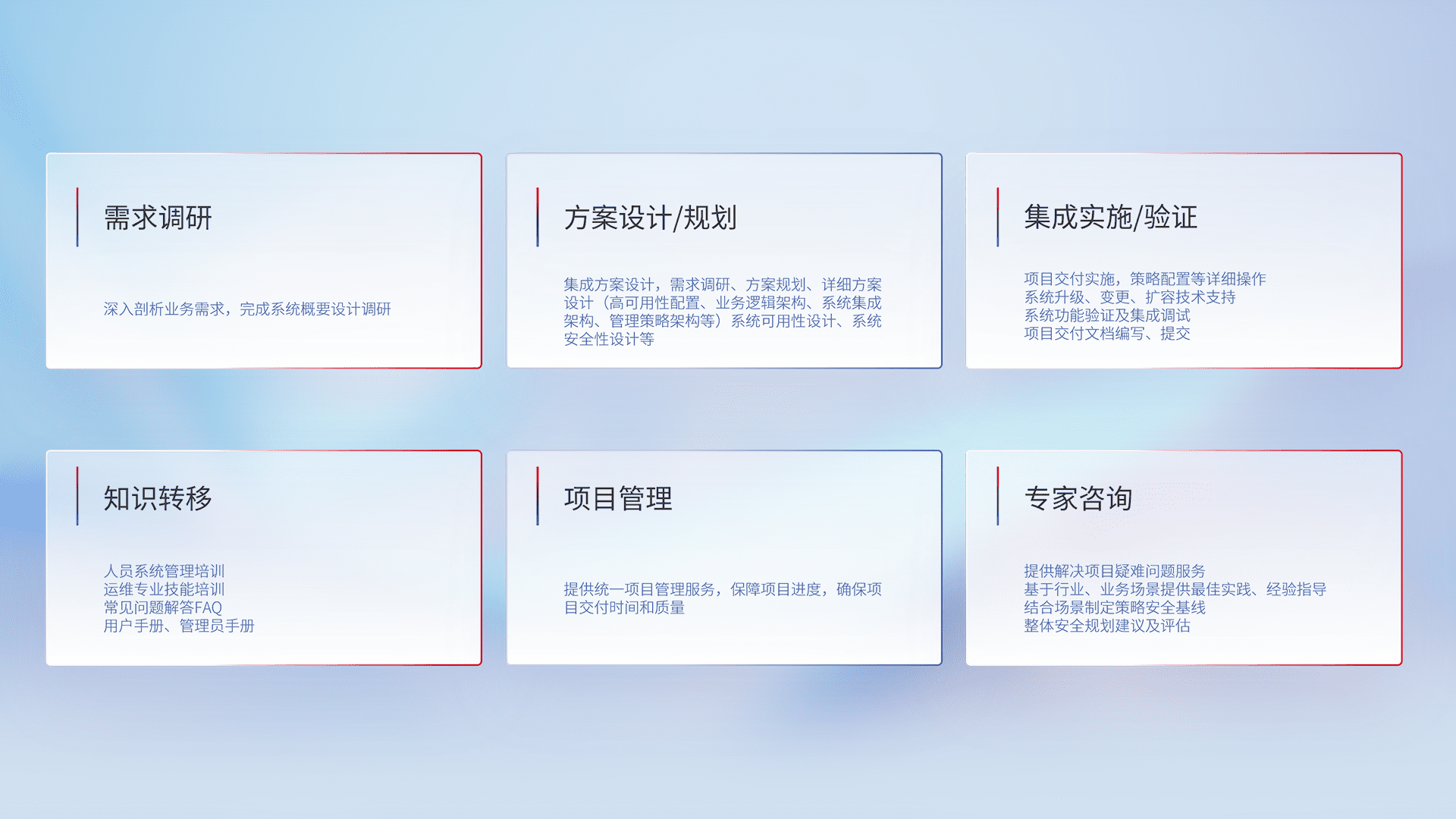 针对客户行业特性,,,,将宏观的安全战略和需求,,,通过专业的交付服务,,,实现项目落地,,为客户提供标准规范的集成交付服务。。。。